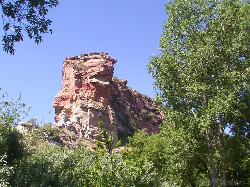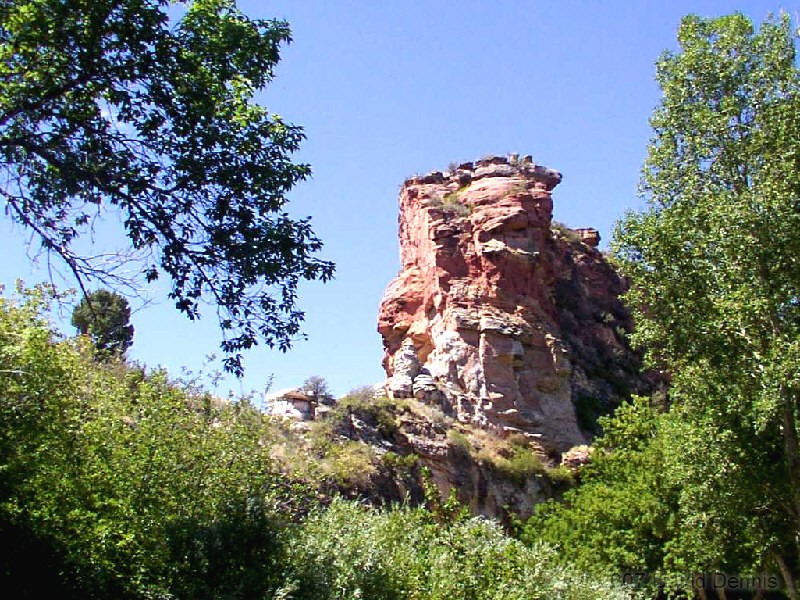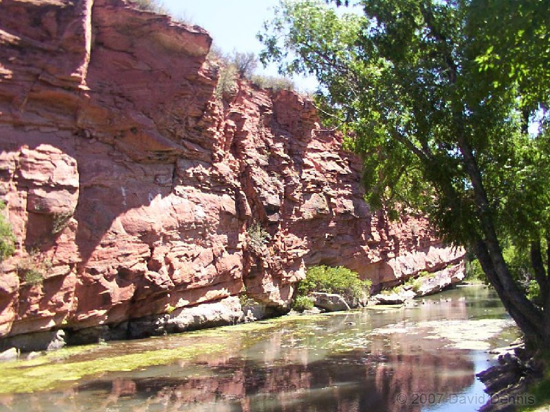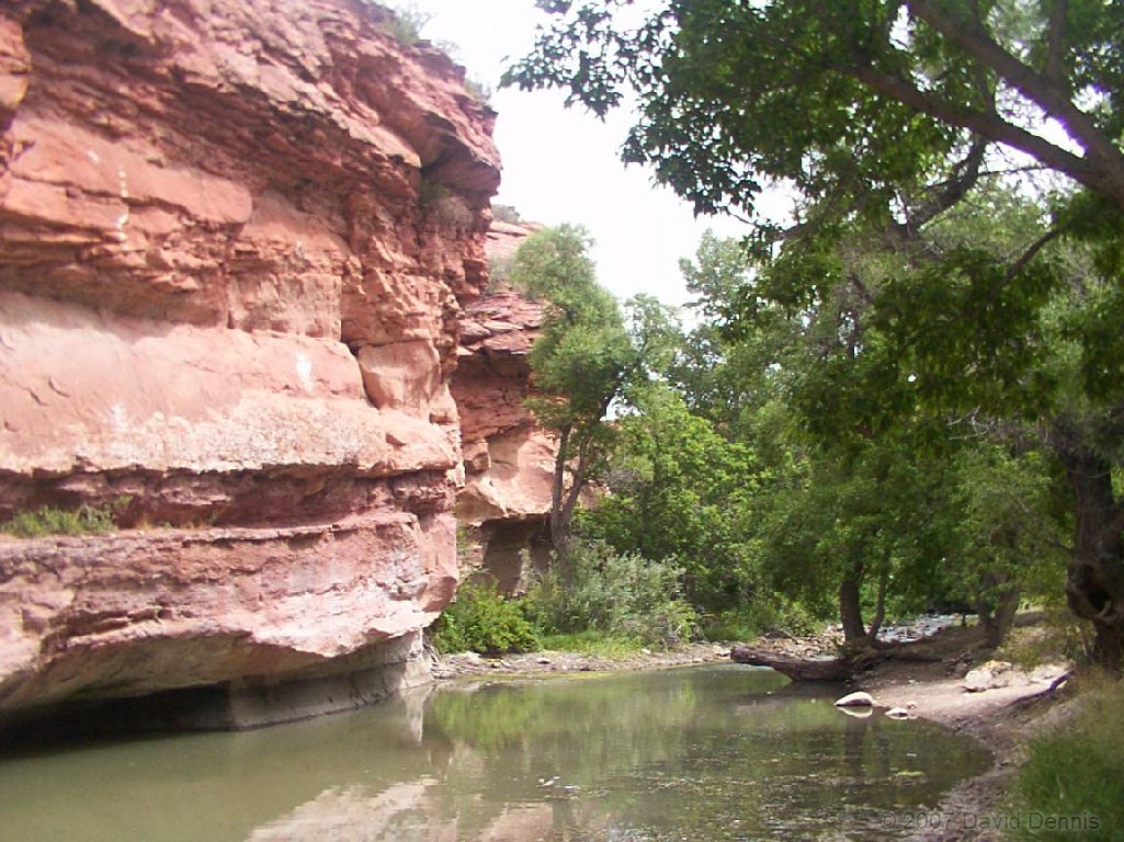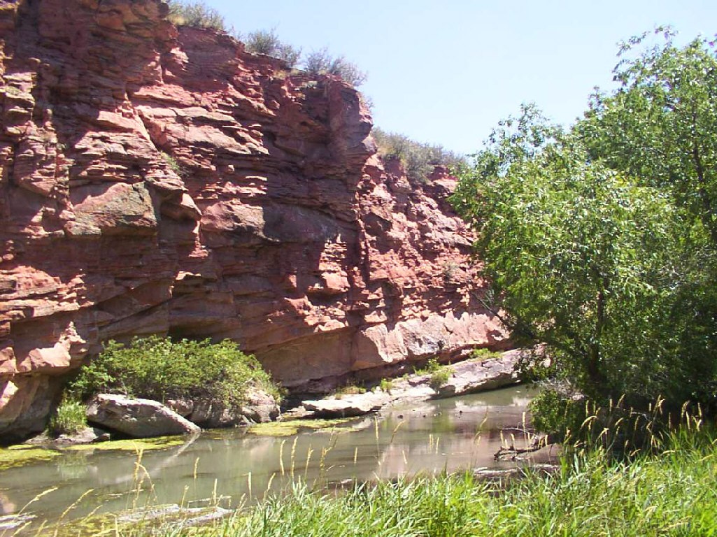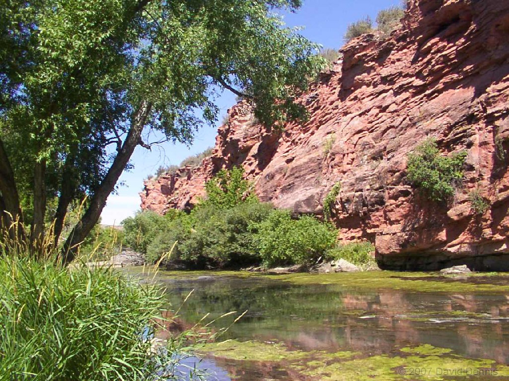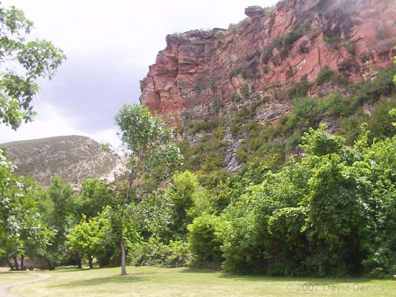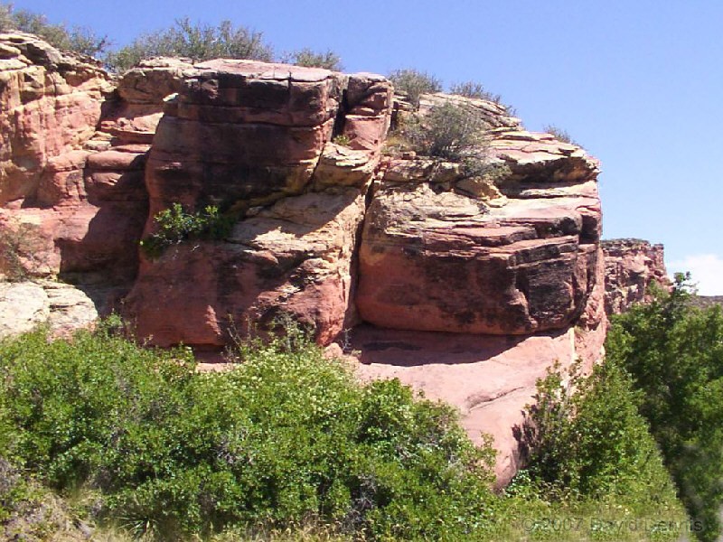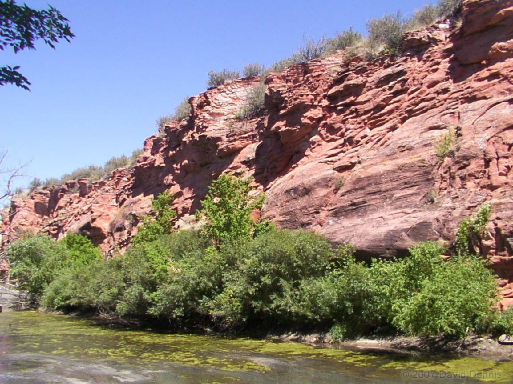 There photographs were all taken in Ayres Natural Bridge Park, Wyoming. The first five were taken on the August 6, 2002, and it was a generally overcast day. The shadows are weaker but the coloring of the rocks seems more distinct. The rest were taken two days later on August 8 in blue skies. I found this park to be a stunning place which is little known.
