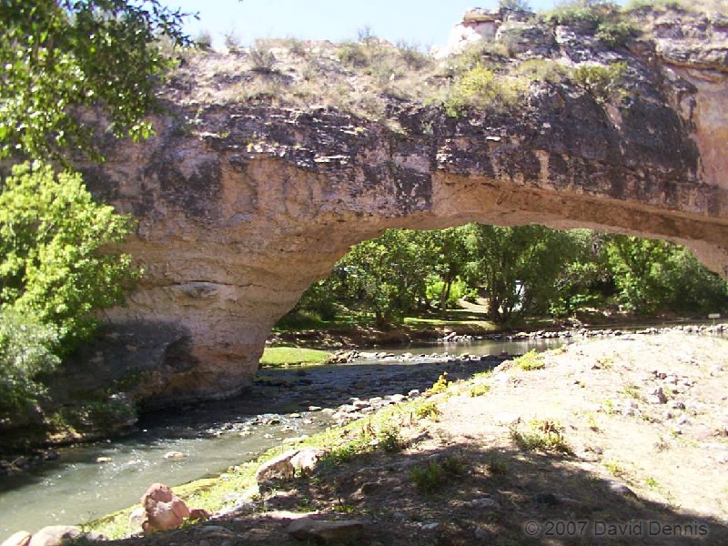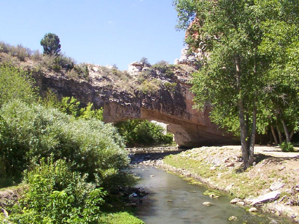 A marker near the site states that the bridge is 20 feet high and has a 90 foot span at the base. A trout stream flows beneath. Facilities are free and maintained by Converse County. Pets are not allowed.