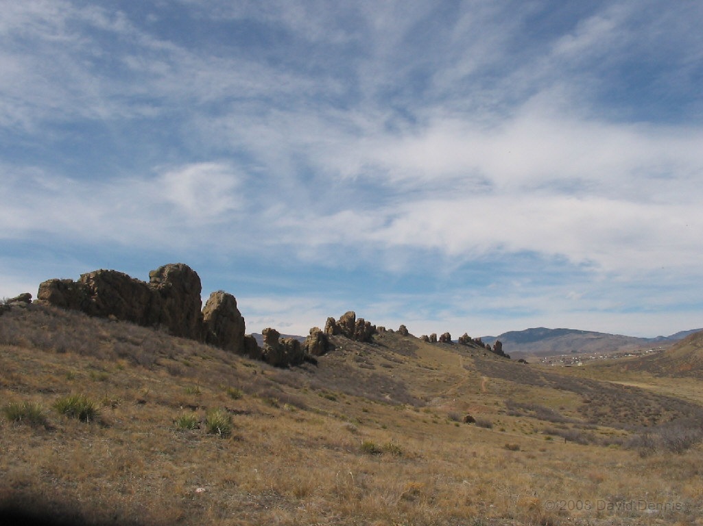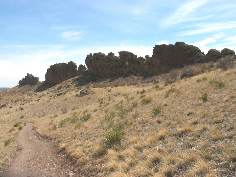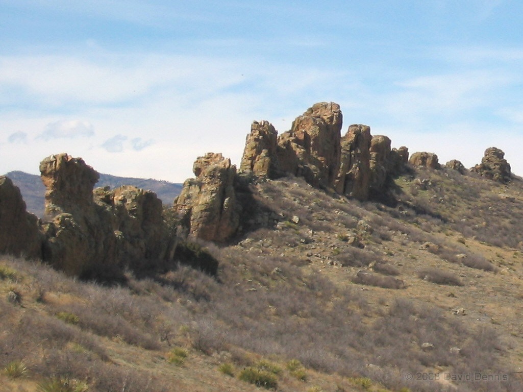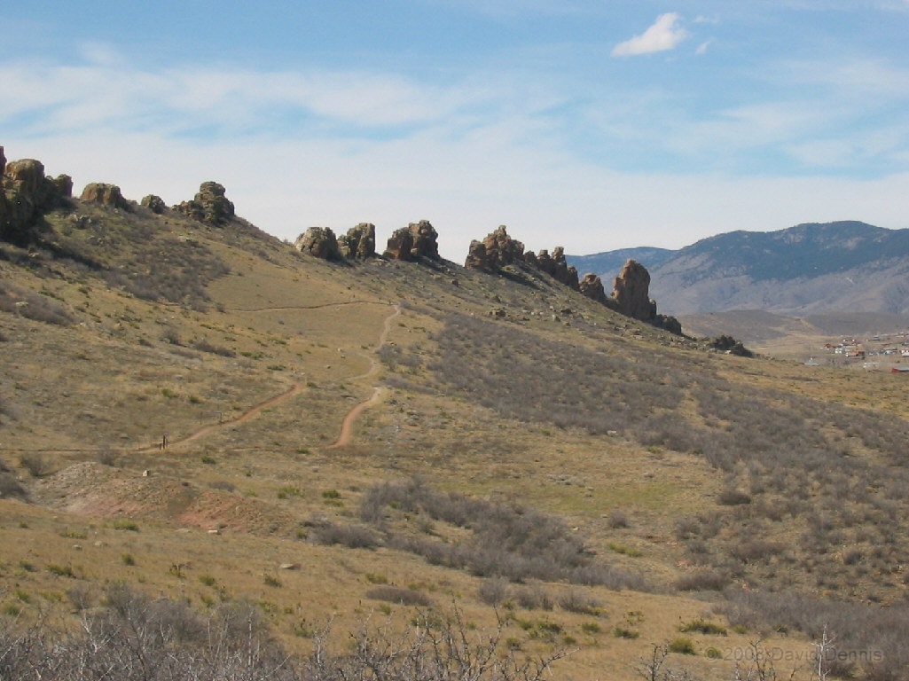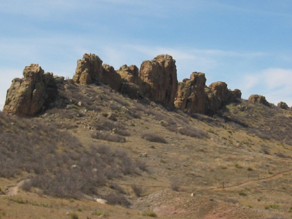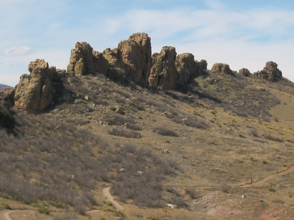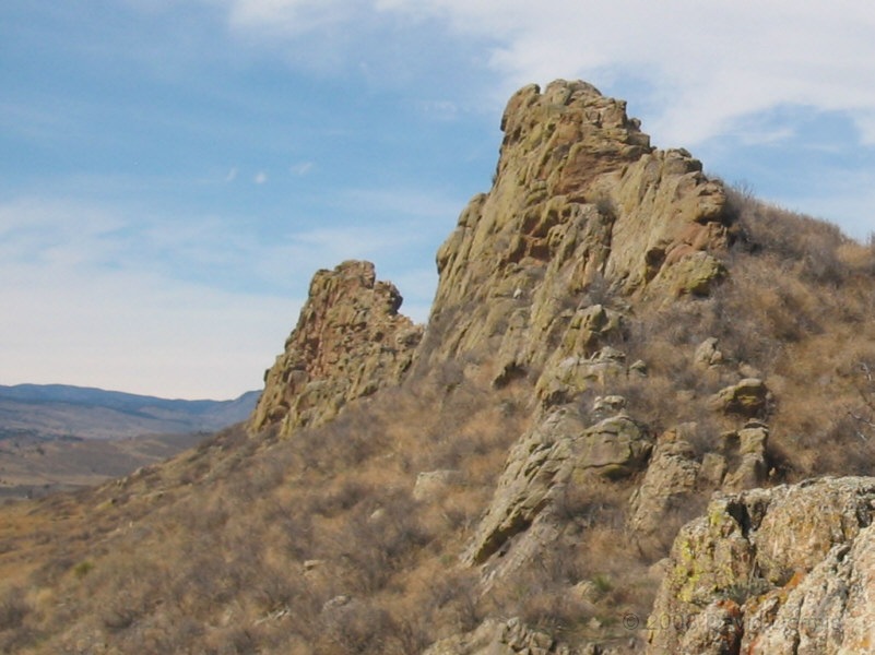 On U.S. Highway 34 just west of Loveland, Colorado there is a jagged ridge of sandstone rocks that is named The Devil's Backbone. Much of the area is now The Devil's Backbone Open Space, a park administered by the city of Loveland with several nice trails for hiking or biking. These photographs were taken in March 2005 late in the day.