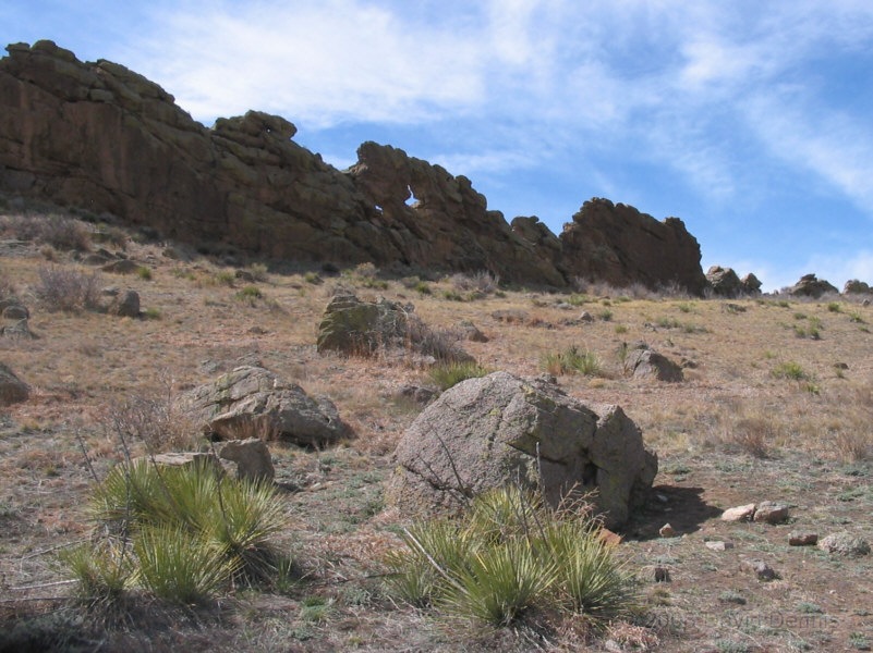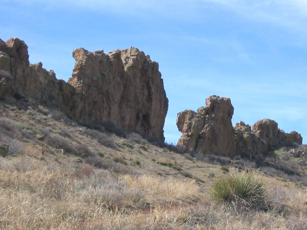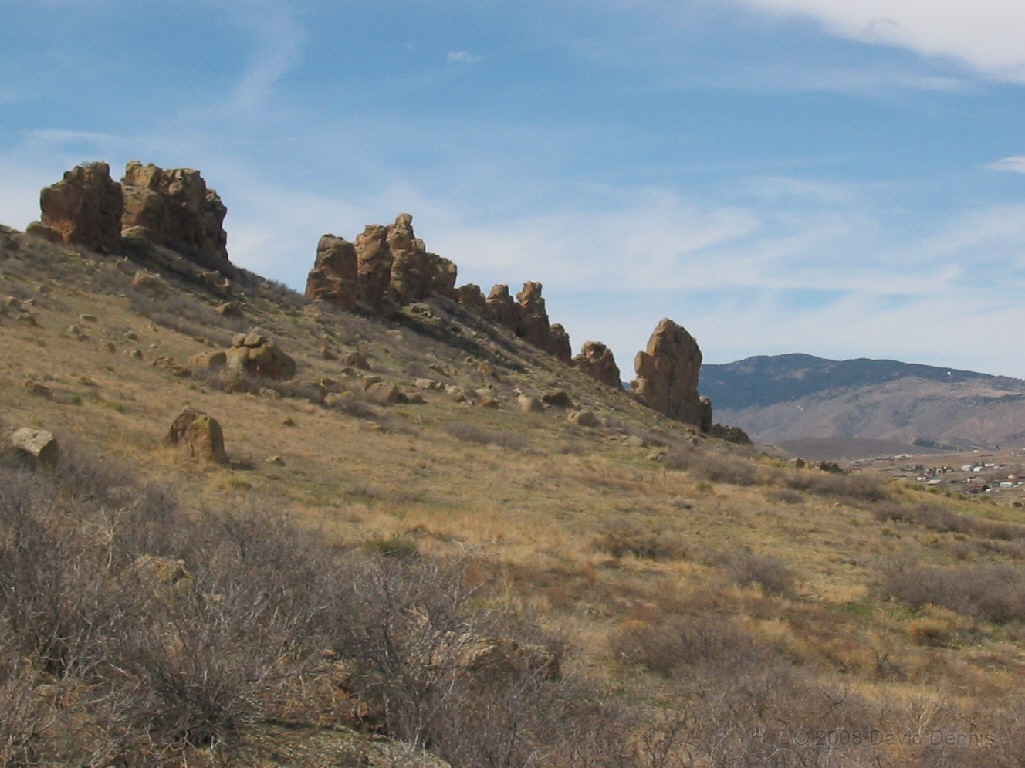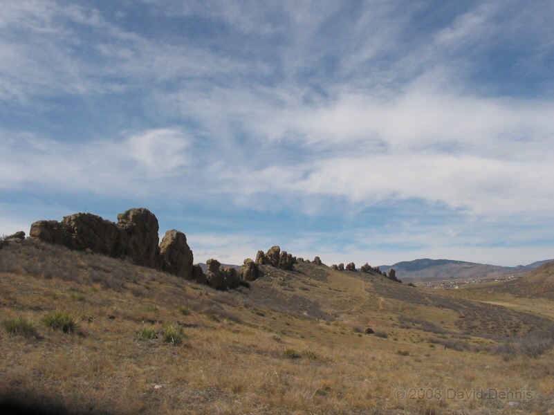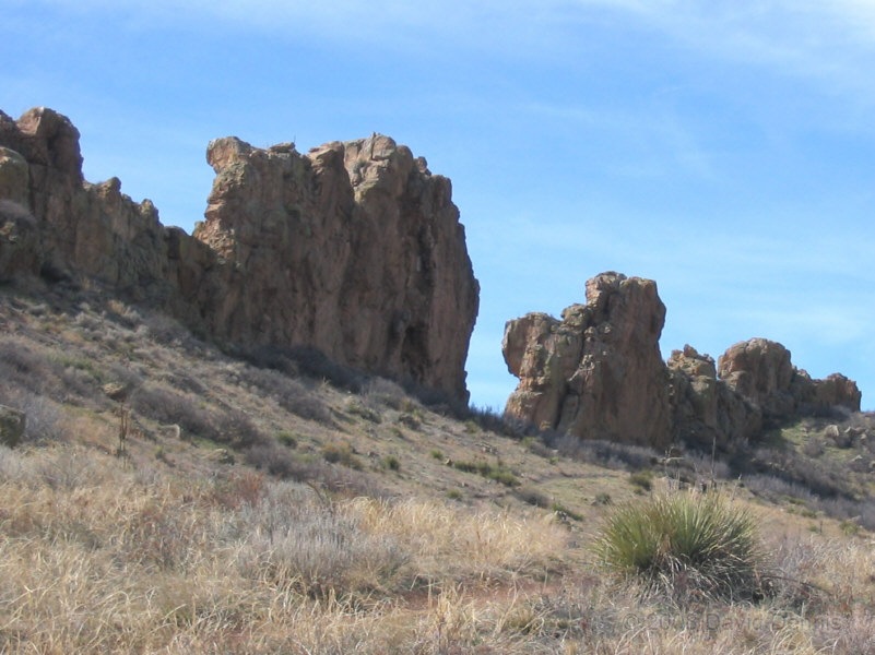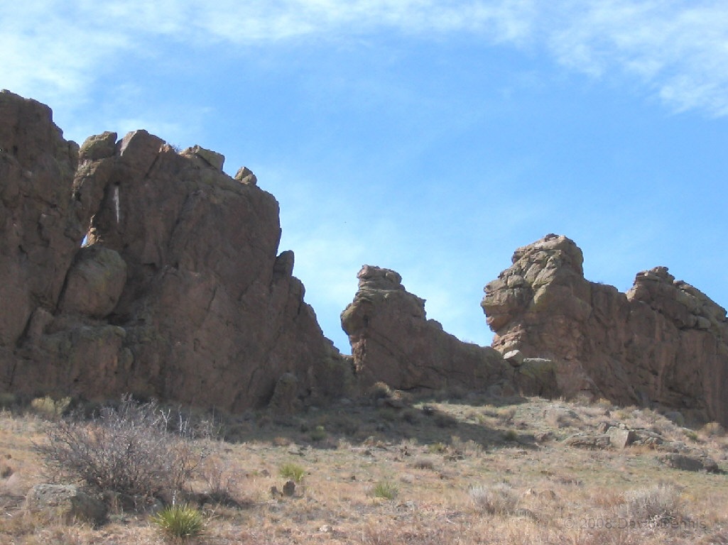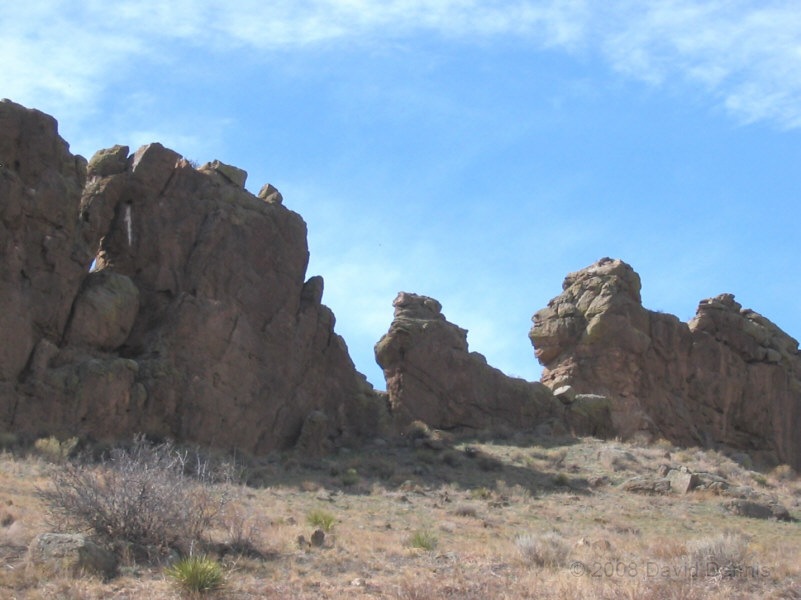 On U.S. Highway 34 just west of Loveland, Colorado there is a jagged ridge of sandstone rocks that is named The Devil's Backbone. Much of the area is now The Devil's Backbone Open Space, a park administered by the city of Loveland with several nice trails for hiking or biking. These photographs were taken in March 2005 late in the day.