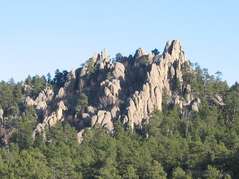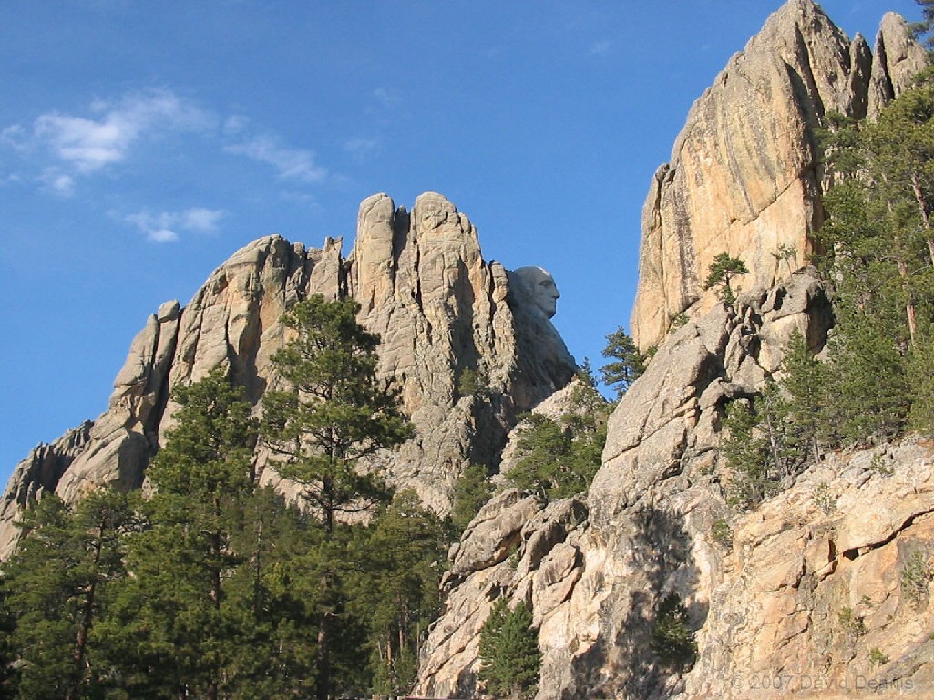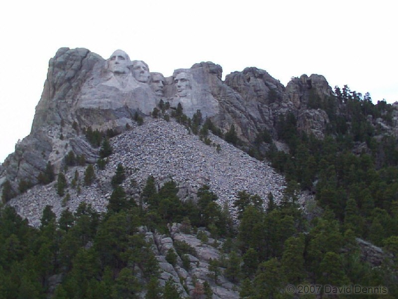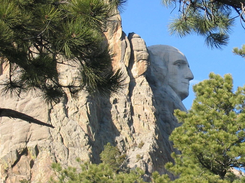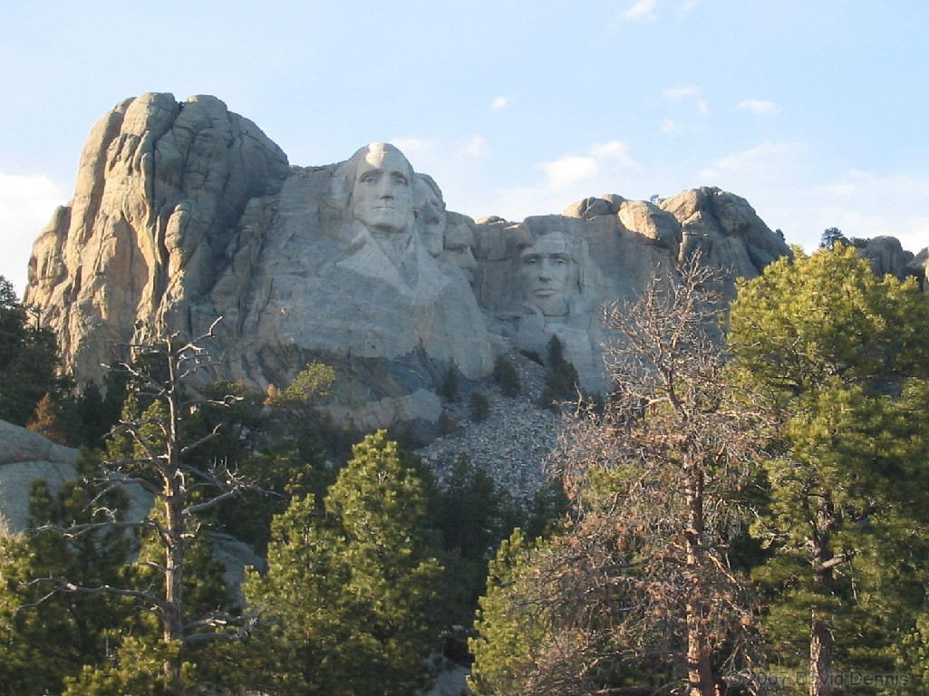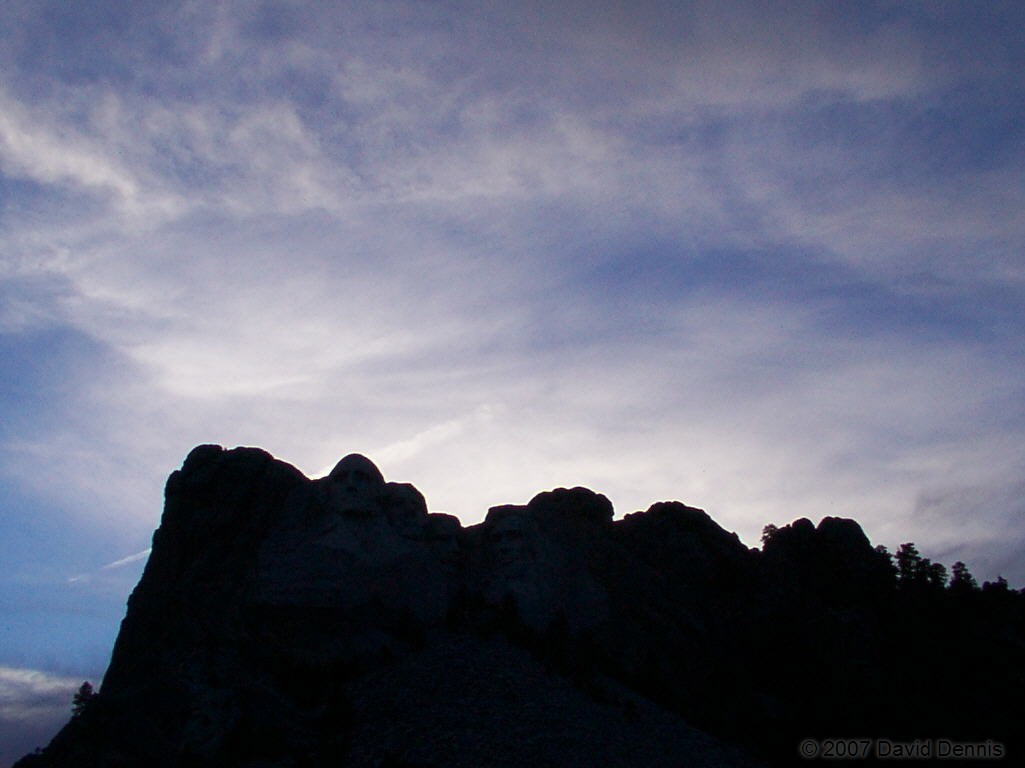 On February 26, 2005, after a long day of visiting other sites in the Black Hills of South Dakota, I arrived late in the day at Mt. Rushmore. The sun had already mostly retreated, and getting photos as good as the ones I took before was no longer possible, so I elected to try taking different types of photos. All of these photos were taken from places near Mt. Rushmore, but not in the regular viewing areas.