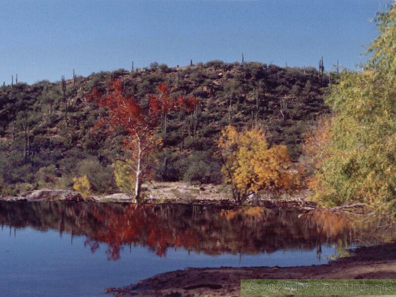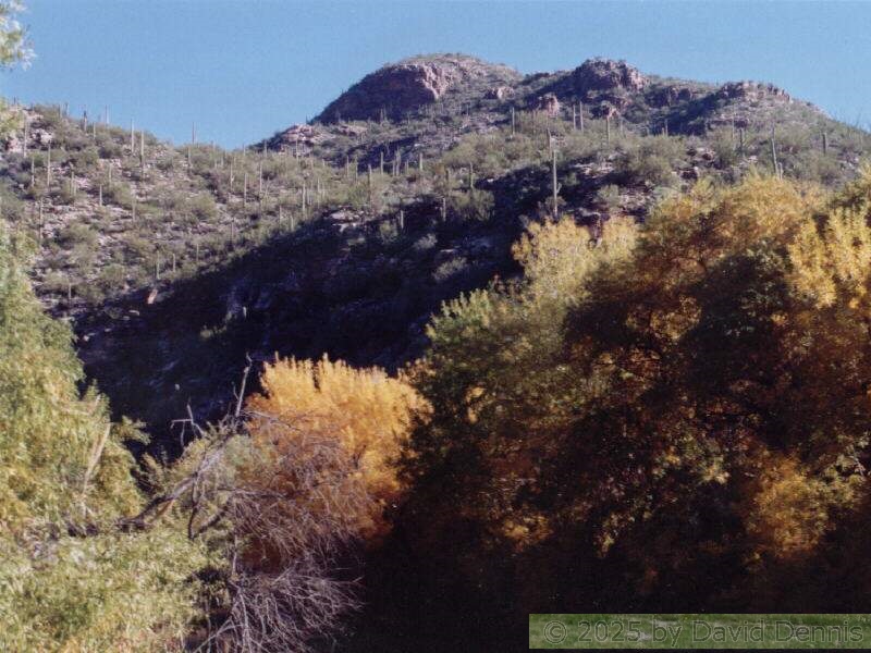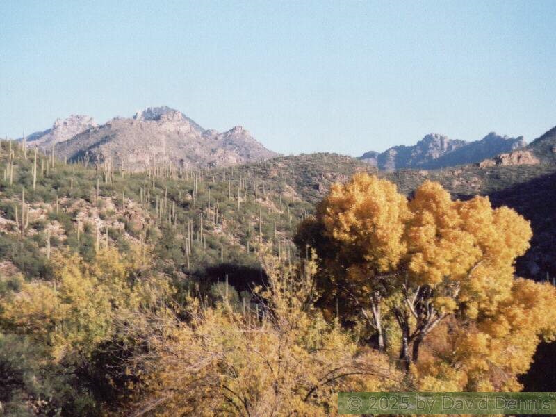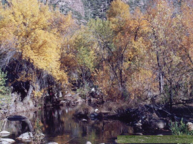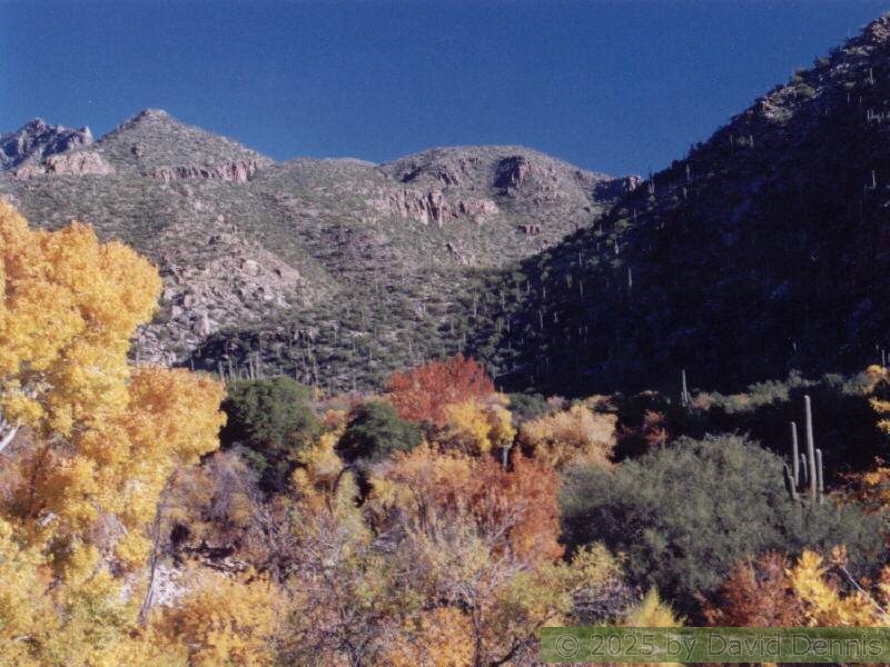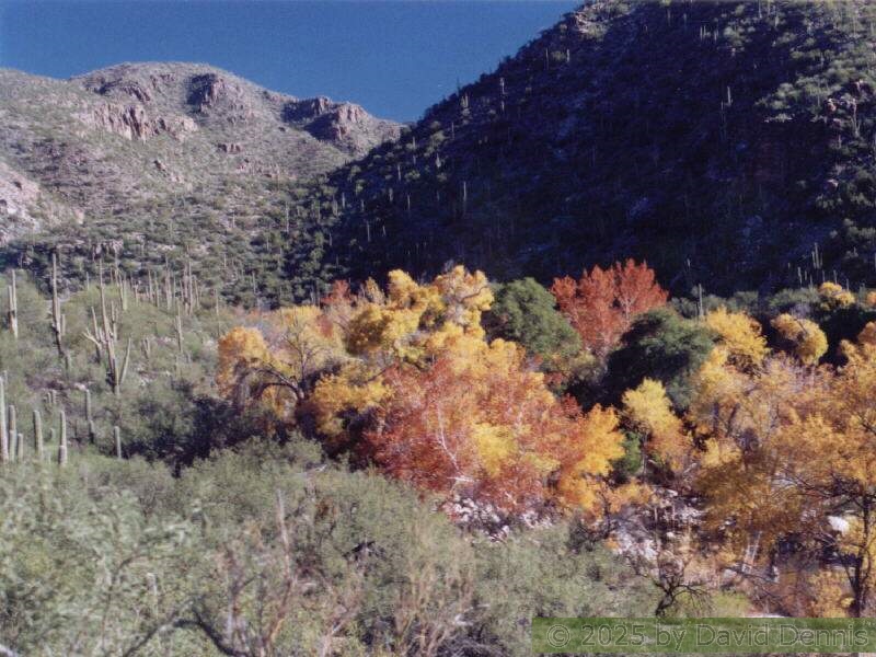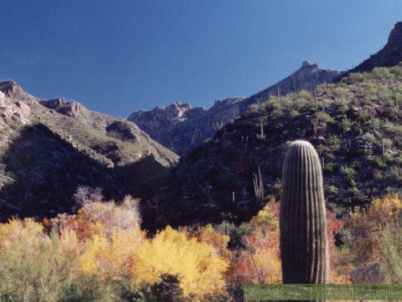 These pictures were taken in November, 2000 in Sabino Canyon. There is a three mile trail into the mountains with numerous other trails going off the main one. All access to this area is by hiking or paying to take a shuttle that runs in the area. I was quite fortunate to go in autumn when the trees were at their best. When you add autumn leaves, rivers, mountains and cactus, you come up with some very interesting pictures.