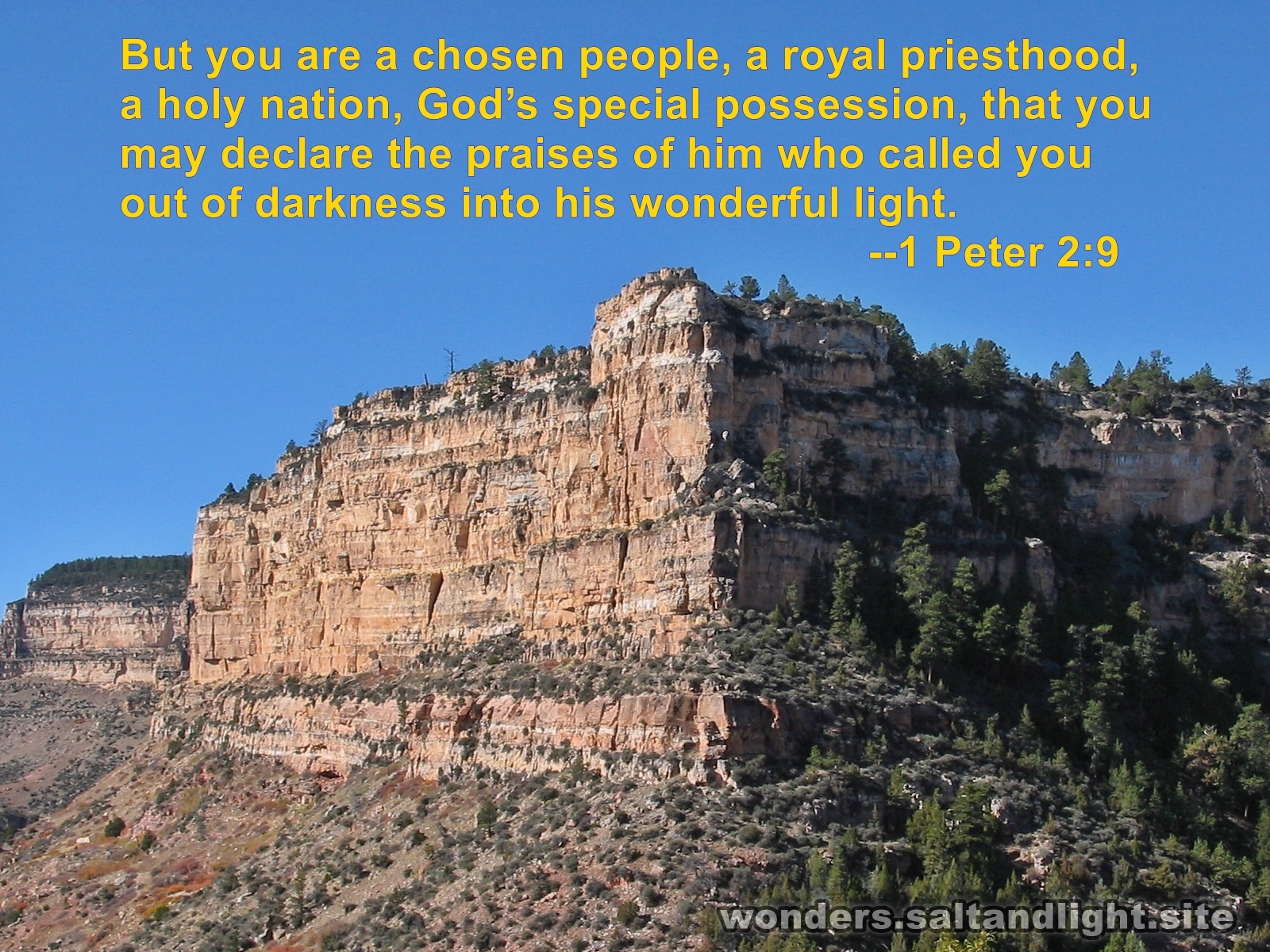 But you are a chosen people, a royal priesthood, a holy nation, God's special possession, that you may declare the praises of him who called you out of darkness into his wonderful light. --1 Peter 2:9 NIV