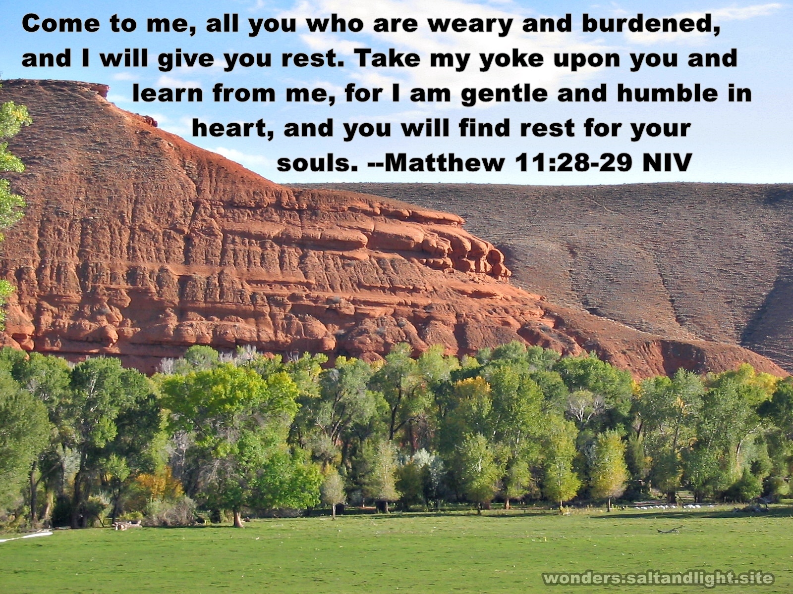 Come to me, all you who are weary and burdened, and I will give you rest. Take my yoke upon you and learn from me, for I am gentle and humble in heart, and you will find rest for your souls. For my yoke is easy and my burden is light. --Matthew 11:28-30 NIV