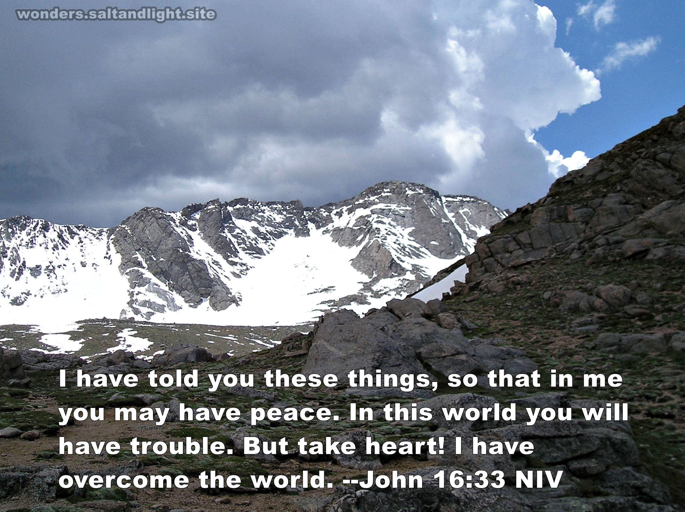 I have told you these things, so that in me you may have peace. In this world you will have trouble. But take heart! I have overcome the world. --John 16:33 NIV