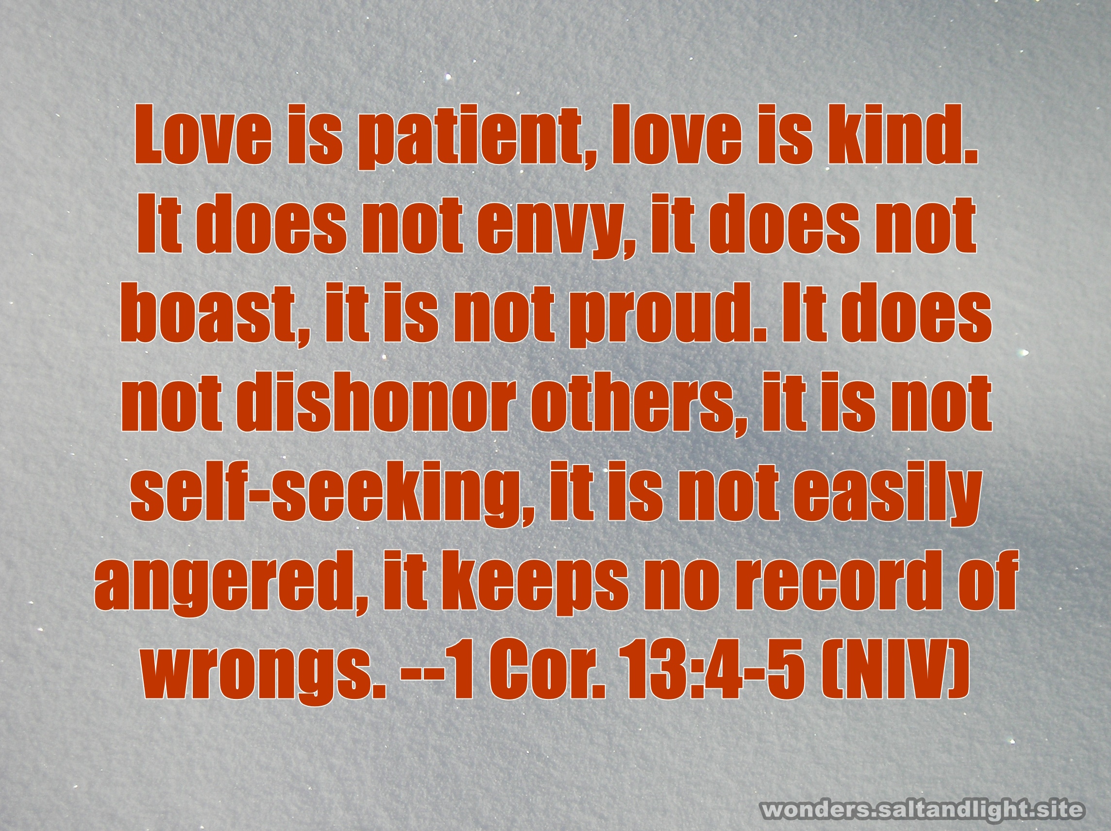 Love is patient, love is kind. It does not envy, it does not boast, it is not proud. It does not dishonor others, it is not self-seeking, it is not easily angered, it keeps no record of wrongs. --1 Corinthians 13:4-5 NIV