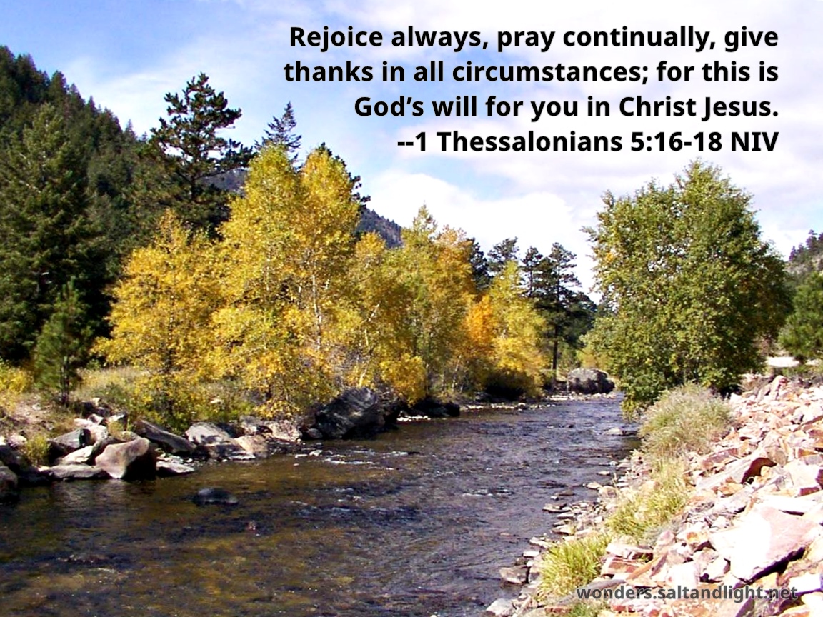 Rejoice always, pray continually, give thanks in all circumstances; for this is God's will for you in Christ Jesus. --1 Thessalonians 5:16-18 NIV