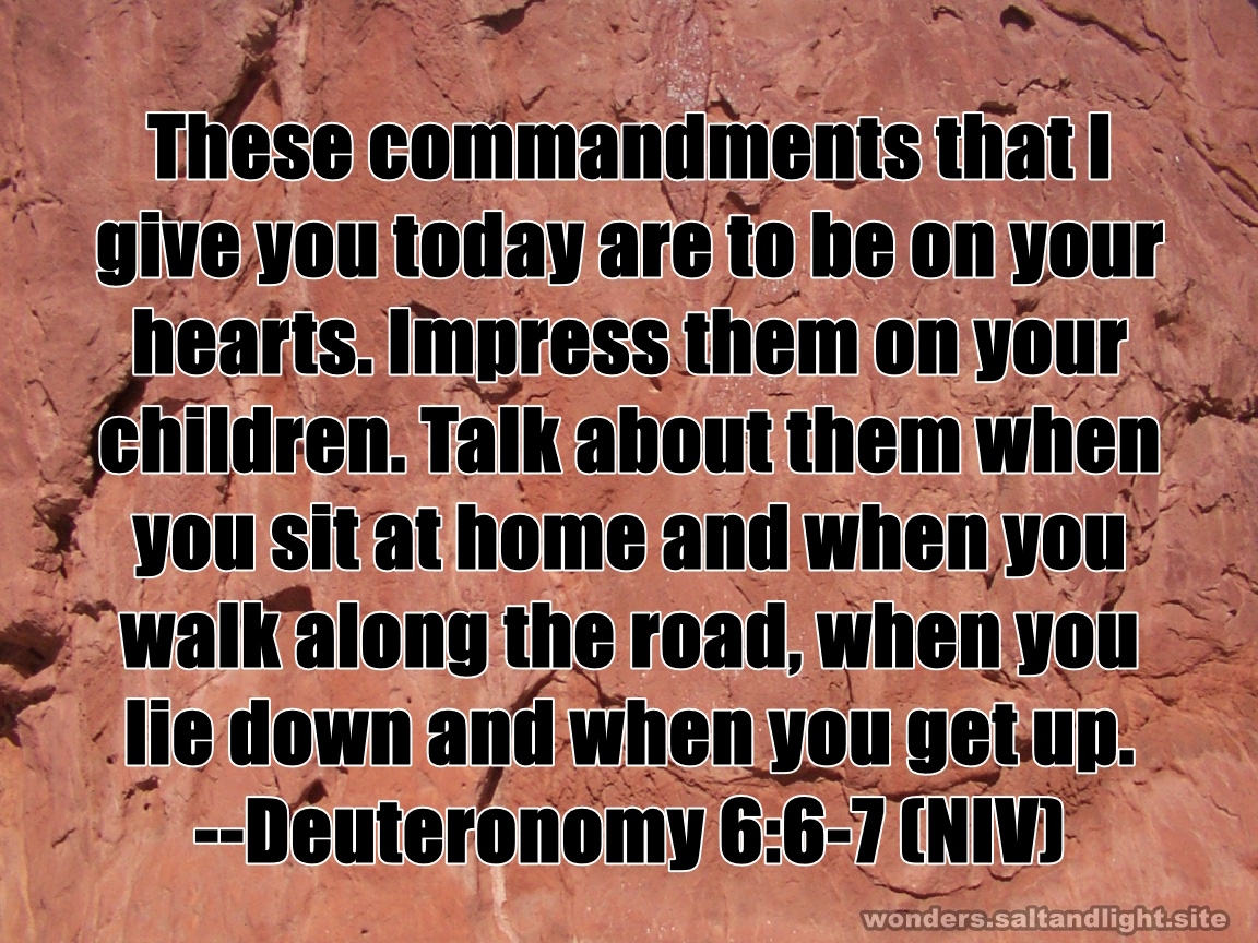 These commandments that I give you today are to be on your hearts. Impress them on your children. Talk about them when you sit at home and when you walk along the road, when you lie down and when you get up. --Deuteronomy 6:6-7