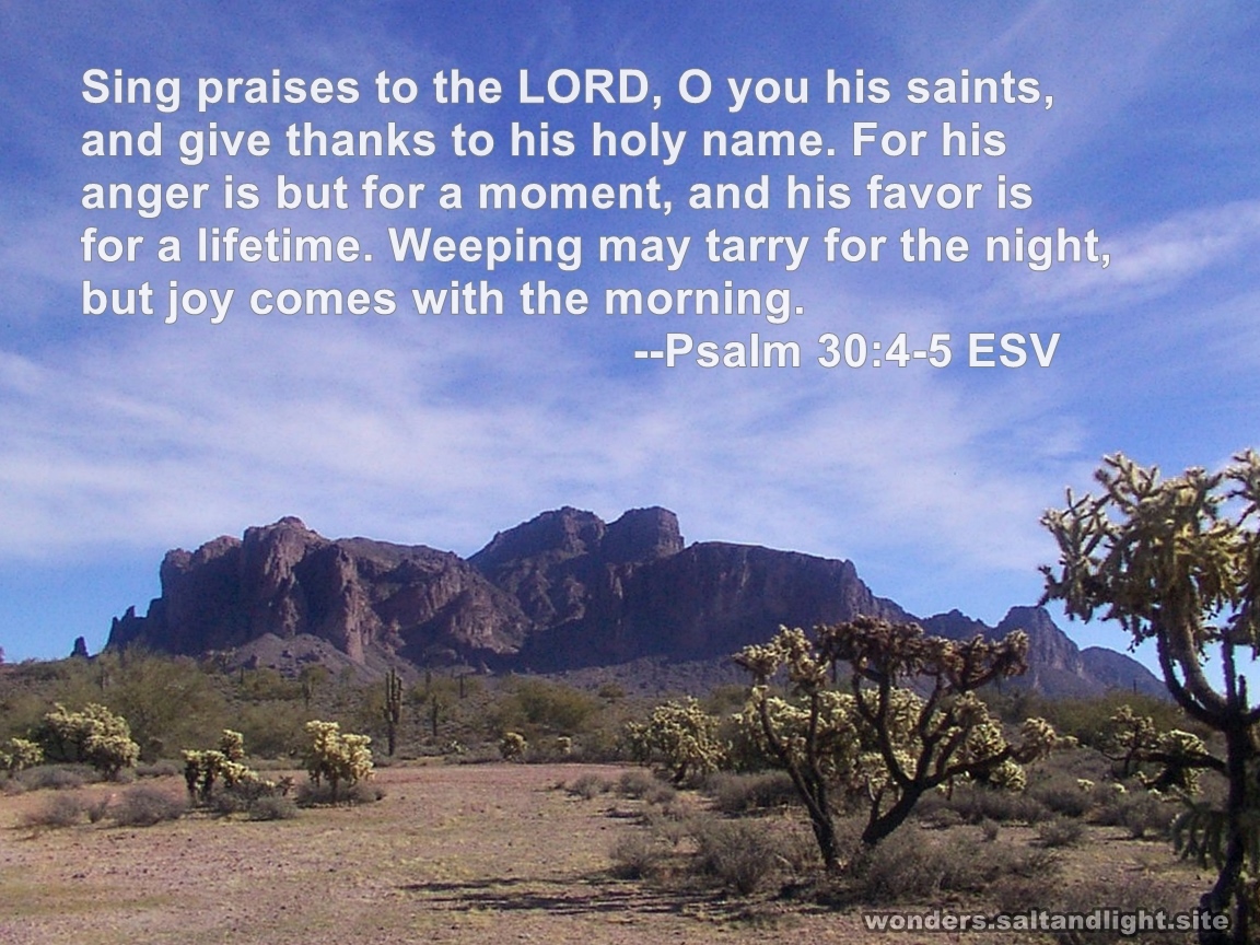 Sing praises to the LORD, O you his saints, and give thanks to his holy name. For his anger is but for a moment, and his favor is for a lifetime. Weeping may tarry for the night, but joy comes with the morning. --Psalm 30:4-5 ESV